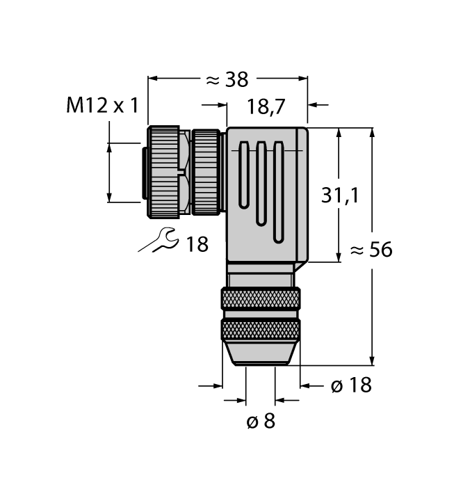 Conector hembra, M12 × 1, Acodado, codificación B